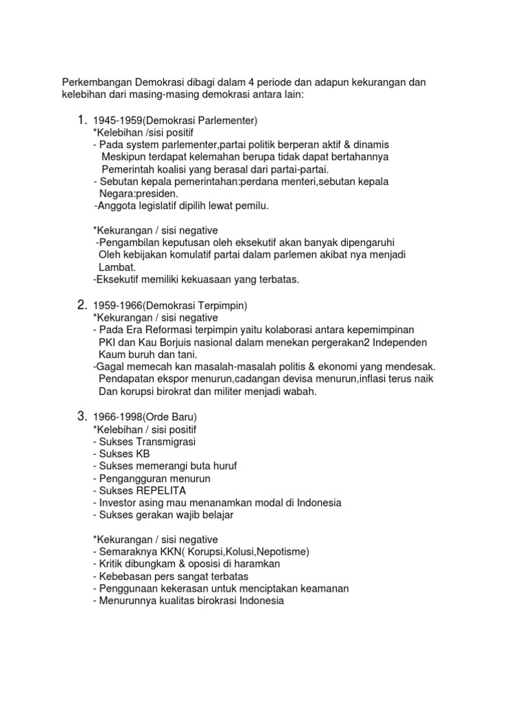 Kekurangan Dan Kelebihan Demokrasi Terpimpin Lengkap from cerdika.com 14 kelebihan dan kekurangan demokrasi komunis di negarannya. Para wakil rakyat dipilih dan harus bertanggung jawab kepada rakyat yang memilihnya. Sistem ekonomi nasional berdasarkan pancasila dan uud 1945 disusun untuk memungkinkan demokrasi ekonomi dan juga dapat digunakan sebagai dasar untuk pembangunan ekonomi. Sistem ekonomi pancasila yang dinyatakan oleh emil salim. Sehingga secara normatif, landasan idiil yang merupakan isi dari sistem. Pengenalan sistem pemerintahan demokrasi amat bermakna bagi sesebuah negara yang mendaulatkan kebebasan rakyat. Kelebihan yang ada tentu memiliki pengaruh yang baik untuk meningkatkan kesejahteraan warga negara dan negaranya. Sistem ekonomi adalah suatu aturan dan tata cara untuk mengatur perilaku masyarakat dalam melakukan kegiatan ekonomi untuk menraih suatu tujuan.